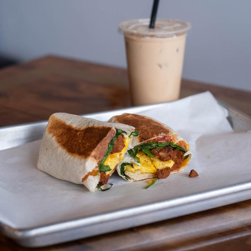 Egg, cheddar, spinach, and tomato with your choice of sausage, bacon, or chorizo, all wrapped up in your choice of a flour, spinach, wheat, or tomato basil tortilla.