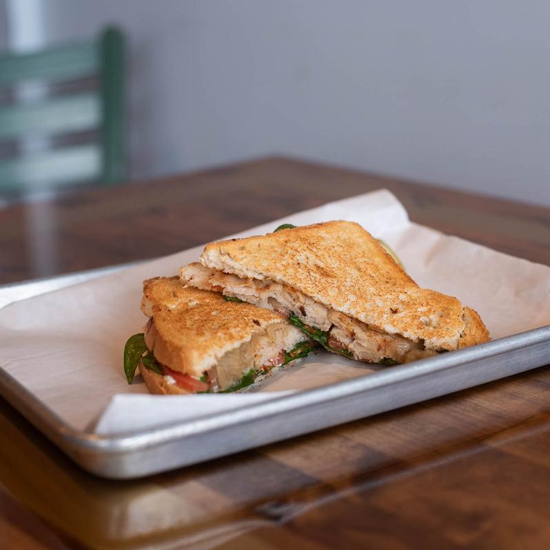 One of our most popular sandwiches! Turkey, sautéed onions, spinach, tomato, mayo, and goat cheese on rosemary garlic bread.